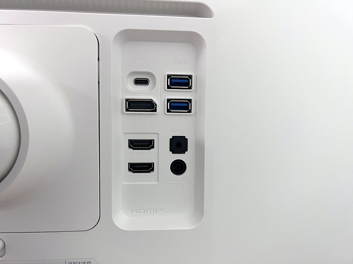 후면단자. DP단자 1개와 HDMI 단자 두개가 있으며 USB-C 단자를 PC 본체에 연결하면 USB 허브처럼 위에 USB3.0 단자를 활용할 수 있다. USB3.0단자는 두개가 있다. 난 여기에 무선마우스 동글과 블루투스 동글을 꼽고 쓰고 있다. 매우 편리함. 아주 맘에 든다. 스피커 또는 헤드폰(이어폰)에 연결할 수 있는 3.5mm 출력 단자도 있다. 다이소표 pc 스피커를 연결해 두었다.