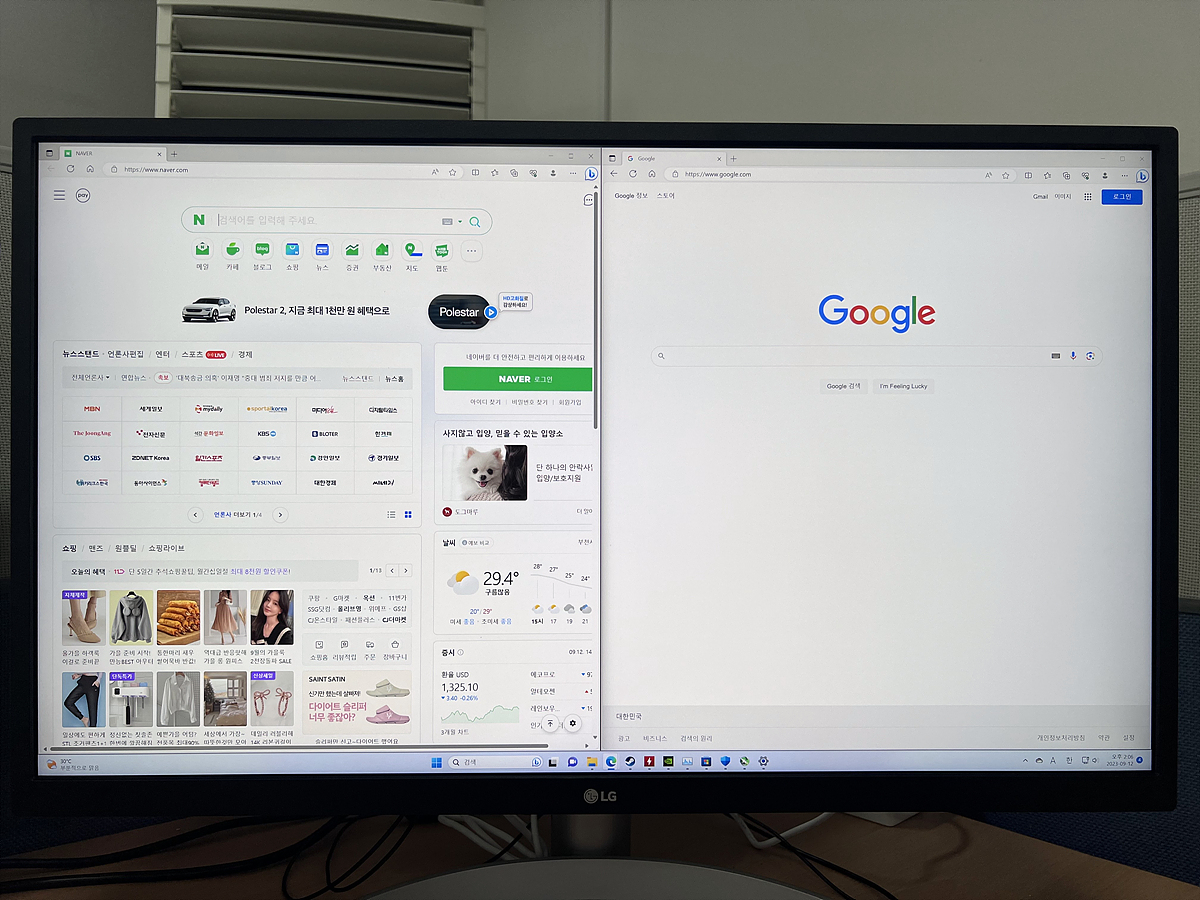 인터넷 창을 두 개 띄어보았다. 사실 많은 분들이 4K는 32인치를 추천하는데 개인적으로 책상앞에 32인치는 너무 커서 한눈에 다 들어오지 않을거 같아서 27인치를 선택했는데 난 마음에 들었다. 윈도우10 또는 11에서는 디스플레이 설정에서 배율 및 레이아웃을 설정할 수 있기 때문에 폰트가 작아서 보지 못하거나 하지 않고 27인치에서도 적당하게 잘 이용할 수가 있었다.